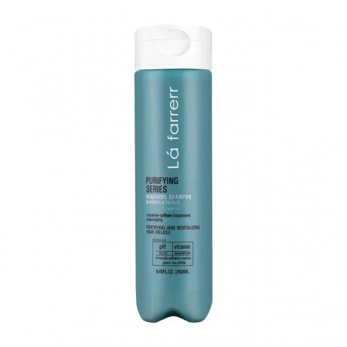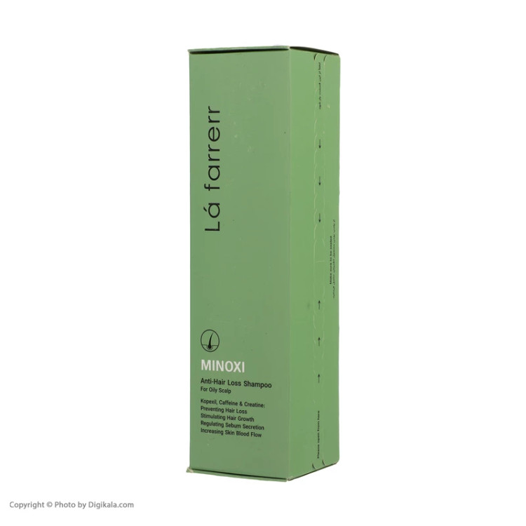 شامپو ماینوکسی لافارر مخصوص موهای چرب و کدر حاوی کوپکسیل (آمینکسیل)، کافئین، کرآتین، Zn-PCA ، عصاره چای سبز و ویتامین B5 است.
